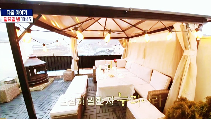 또, 두 사람은 고급 휴양지에서나 볼 법한 루프탑 공간을 소개하며 파고라와 테이블, 바비큐 그릴과 난로가 기본 옵션이라고 말한다. 승리를 예감한 두 사람은 분위기에 취해 SNS 감성사진을 찍으며, 샴페인 잔을 들고 역할 놀이에 빠졌다는 후문이다.